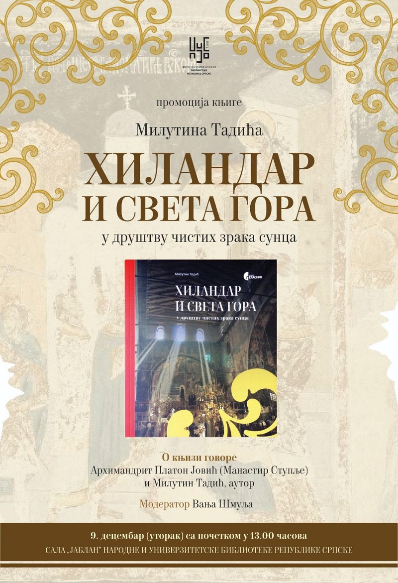 Промоција књиге "Хиландар и Света Гора у духу чистих зрака сунца" аутора Милутина Тадића биће одржана у уторак, 9. децембар 2025. године, са почетком у 13.00 часова у Сали за промоције "Јаблан" Народне и универзитетске библиотеке Републике Српске.